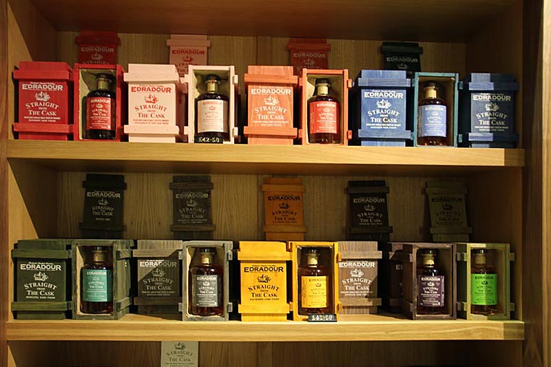 Aber auch Edradour als solches pflegt eine ungewöhnliche Vielfalt an verschiedenen Abfüllungen mit verschiedenen Finishes mit Etiketten Kisten verschiedener Farben.