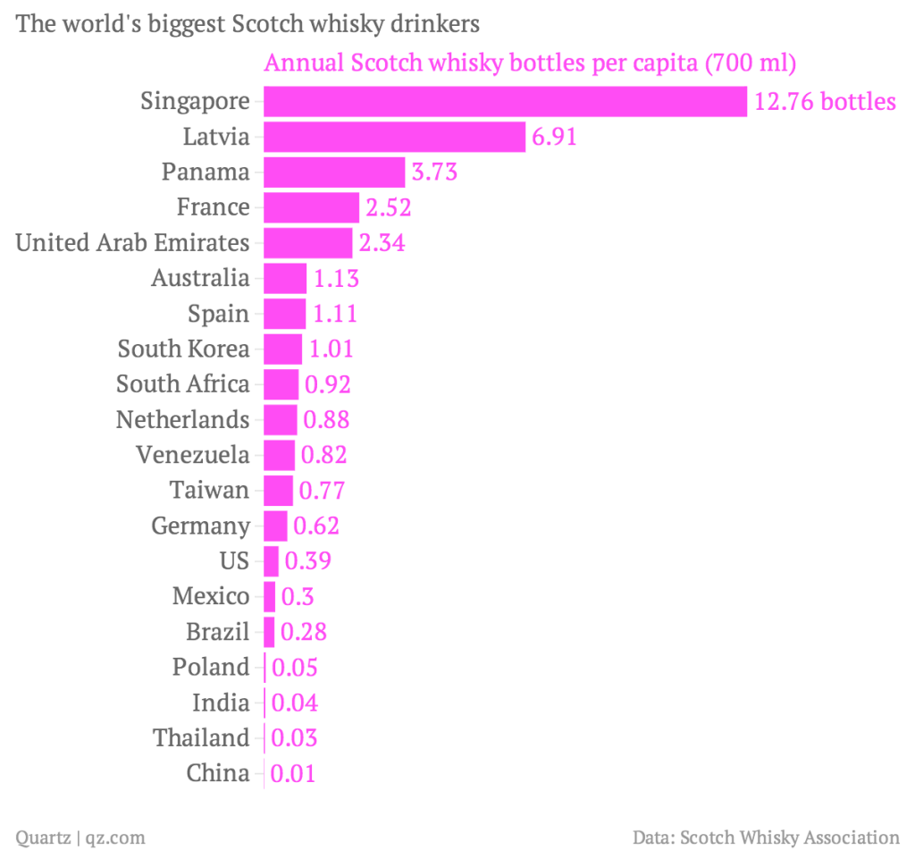 Wo wird wieviel schottischer Whisky getrunken? Man hat das Gefühl, dass Scotch in Deutschland momentan sehr populär ist. Es gibt aber Länder, in denen der Pro-Kopf-Verbrauch um ein Vielfaches höher ist, wie eine kürzlich durchgeführte Erhebung ergab. Danach führt Singapore dieses Ranking an, wobei hier eine Rolle spielen könnte, dass Singapore als typischer Stop-Over-Platz viel schottischen Whisky in den Duty-Free-Geschäften auf dem Flughafen umsetzt. Grafik von: http://qz.com/165628/whos-drinking-the-worlds-scotch-whisky/ |
