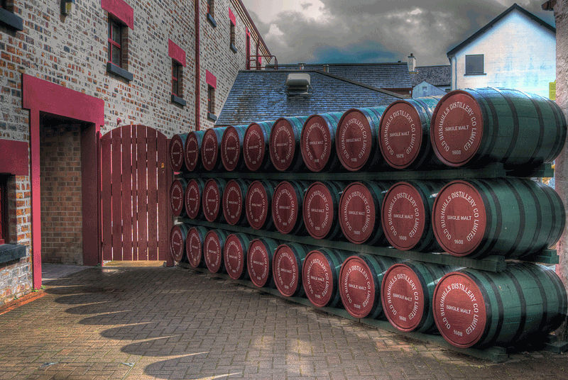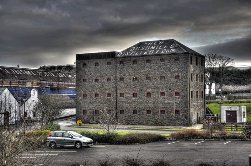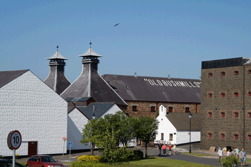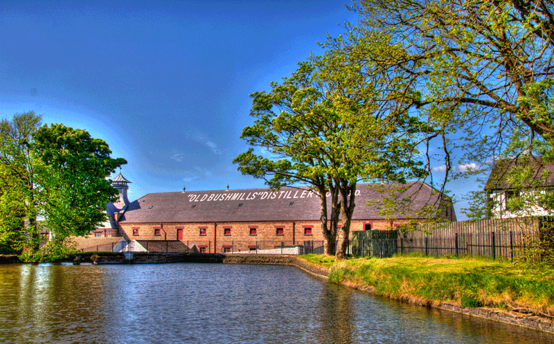 Bushmills Diese traditionsreiche Brennerei befindet sich im äußersten Norden Nordirlands im County Antrim. Die unmittelbare Nähe des Flusses Bush ergab gute Bedingungen für die Errichtung einer Destillerie. Daher stammt auch der Name der Brennerei 'Mühle am Fluss Bush'. Old Bushmills rühmt sich damit, die älteste noch produzierende Whiskey-Brennerei zu sein. Einige andere Brennereien betreiten dies zwar, aber Bushmills hat dennoch eine lange Tradition, wenngleich es Höhen und Tiefen gab. Ein hauseigenes Besucherzentrum lädt Besucher mit verschiedenen Touren durch die Destillerie zum Verweilen ein.