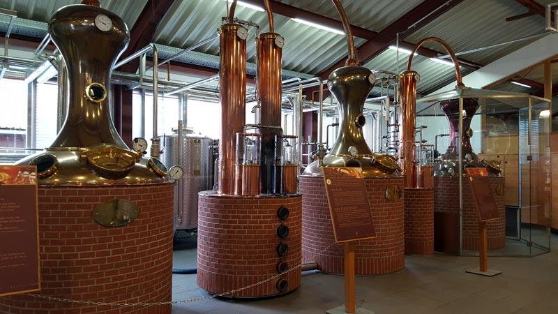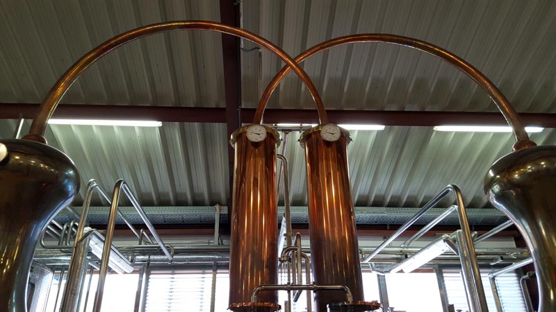 Dann kann man sich frei in der Destillerie bewegen. Es wurde gerade nicht gearbeitet. Offenbar wird hier nicht durchgängig destilliert. Im Gebäude mit dem Shop findet man die Maischebottiche, sowie die verschiedenen Stills. |