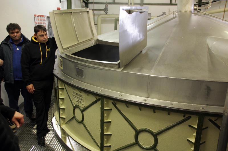 Viel Information mit Witz herüber gebracht. Das hat richtig Spaß gemacht. Wir haben alle Schritte durchlaufen, angefangen bei den Einfüllbereichen für das Malz. Dann kam der große Maischbottich. Hier wird unter mehrmaliger Wasserzugabe das Malz eingemaischt.