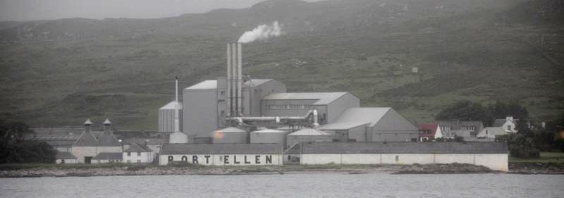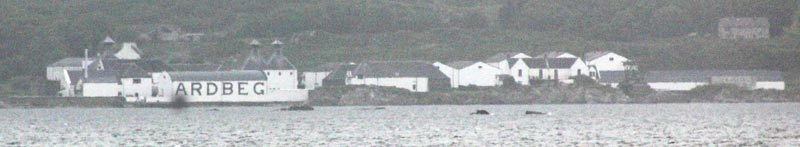 Von Oban ging es weiter zur Fähre nach Kenncraig. Dort ließ ich meinen kleinen Holden stehen und ging zu Fuß auf die Fähre. Wir trafen uns oben und fuhren bei schlechtem Wetter Richtung Port Ellen. Unterwegs kamen wir an den drei Destillerien Ardbeg, Lagavulin und Laphroaig vorbei die aber nur in großer Entfernung mehr zu erahnen als zu sehen waren. Hier die Aufnahmen mit 250er Objektiv bei Regen und Nebel, voll gezoomt vom bewegten Schiff aus. Ardbeg: