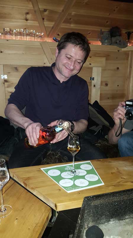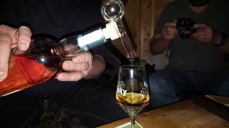 Und das Eingießen wurde dieses Mal perfektioniert. Jürgen hatte eine Eingießhilfe vom Feinsten, einschließlich selbst gebautem Adapter für die größere Öffnung der Balblair-Flasche.
