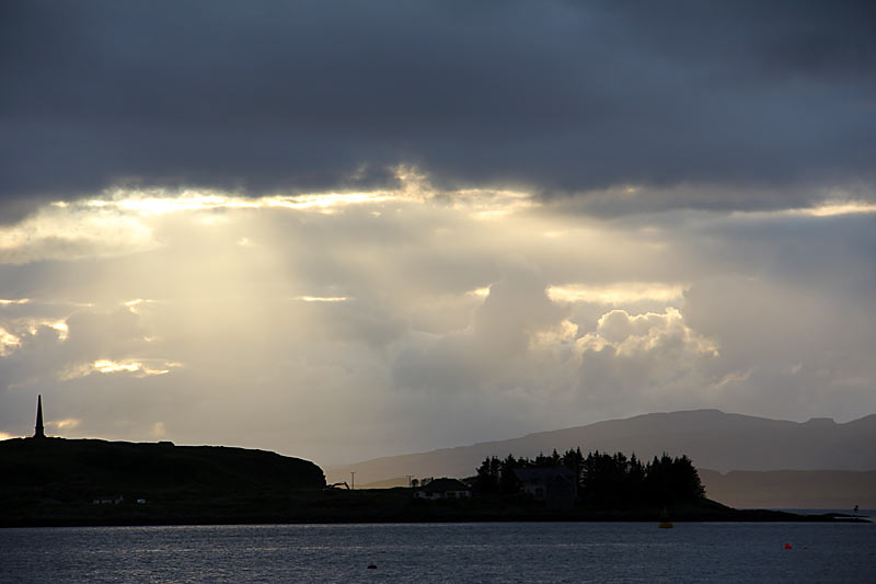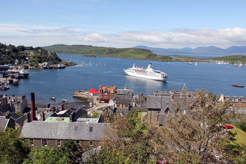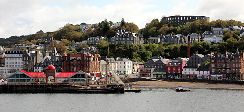 - Tag 2 - Donnerstag - Beim Frühstück mussten wir einen Augenblick warten. Die Küche unseres Bed & Breakfasts versorgte mehrere Unterkünfte. An unserem Tisch saßen zwei nette Mädels aus Deutschland, bei Peter am Tisch zwei Kiwis aus Oamaru. Eigentlich hätte ich mit ihm tauschen müssen. Dann fuhren wir mit der Fähre zur Insel Mull, vorbei an Oban. MAn hat von der Fähre aus einen herrlichen Blick auf die Stadt mit ihrem Colosseum auf dem Berg.