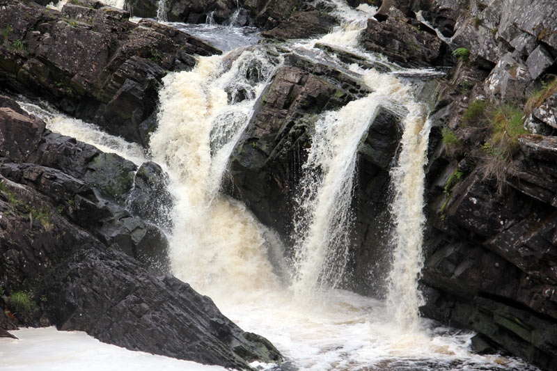 Dann fuhren wir durch die Highlands weiter nach Grantown on Spey. Unterwegs hielten wir an einem schwarzen Wasserfall mit Lachsen (Rogie Falls). Das Wasser ist wirklich schwarz eingefärbt und es springen Lachse. Ich habe selbst einen recht großen springen sehen. Leider tat uns dann mit der Kamera im Anschlag keiner mehr den Gefallen, zu springen.