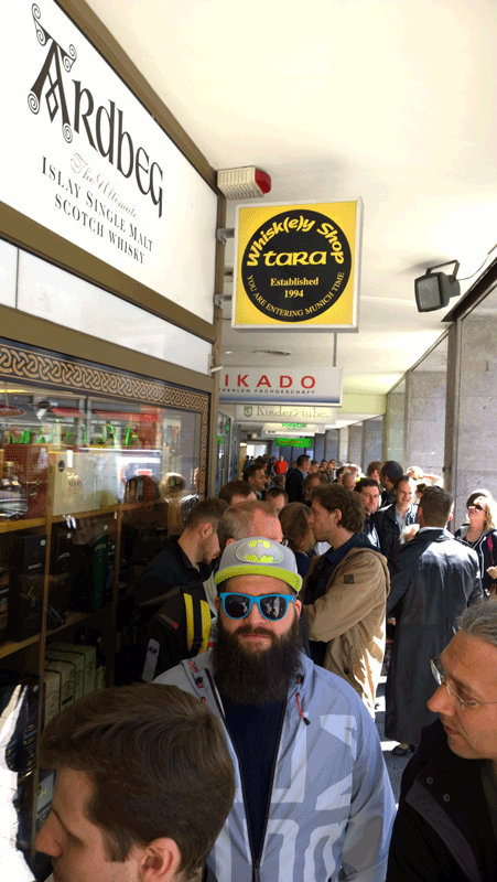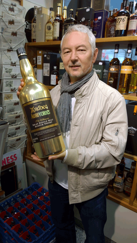 Am nächsten Morgen standen wir dann am Whisky Shop Tara in München, einer der drei Ardbeg Embassys in Deutschland an und ergatterten unseren Auriverdes. Diese grüne Flasche fasst aber nur 0,7 Liter, nicht wie die goldene auf dem Bild 4,5 Liter. Aber es gab noch einen zum Probieren. Uns schmeckt er ausgezeichnet.